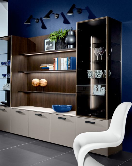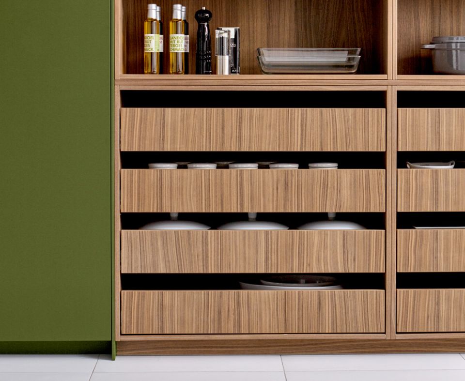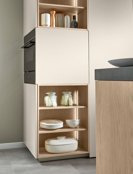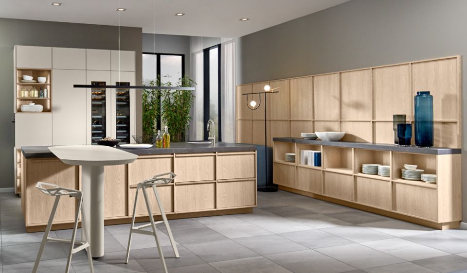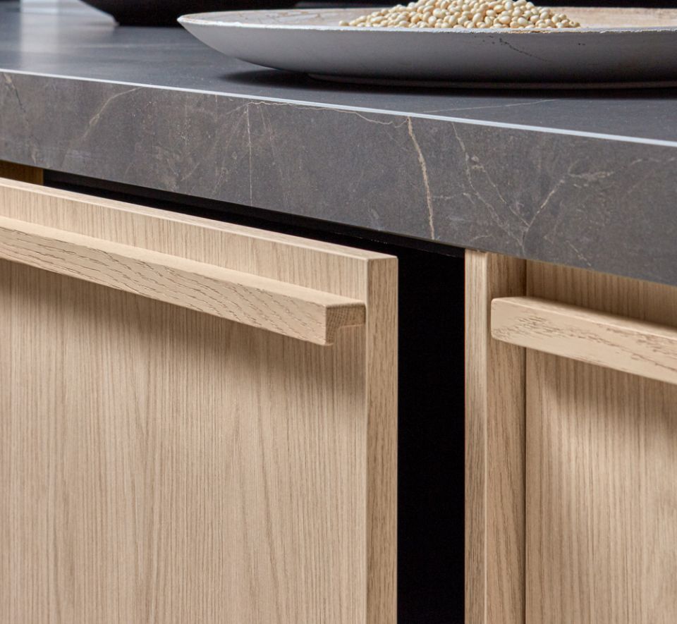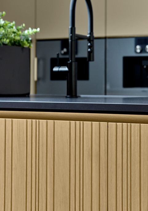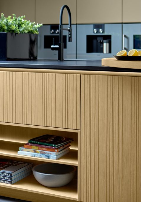 Ausdrucksstarke Furnierfronten mit asymmetrischer Rille liegen im Trend. In Kombination mit Steinelementen, runden Arbeitsplatten und wandhängenden Elementen entsteht ein exklusiver Raum, der zum Wohlfühlen, Genießen – und Durchatmen einlädt.